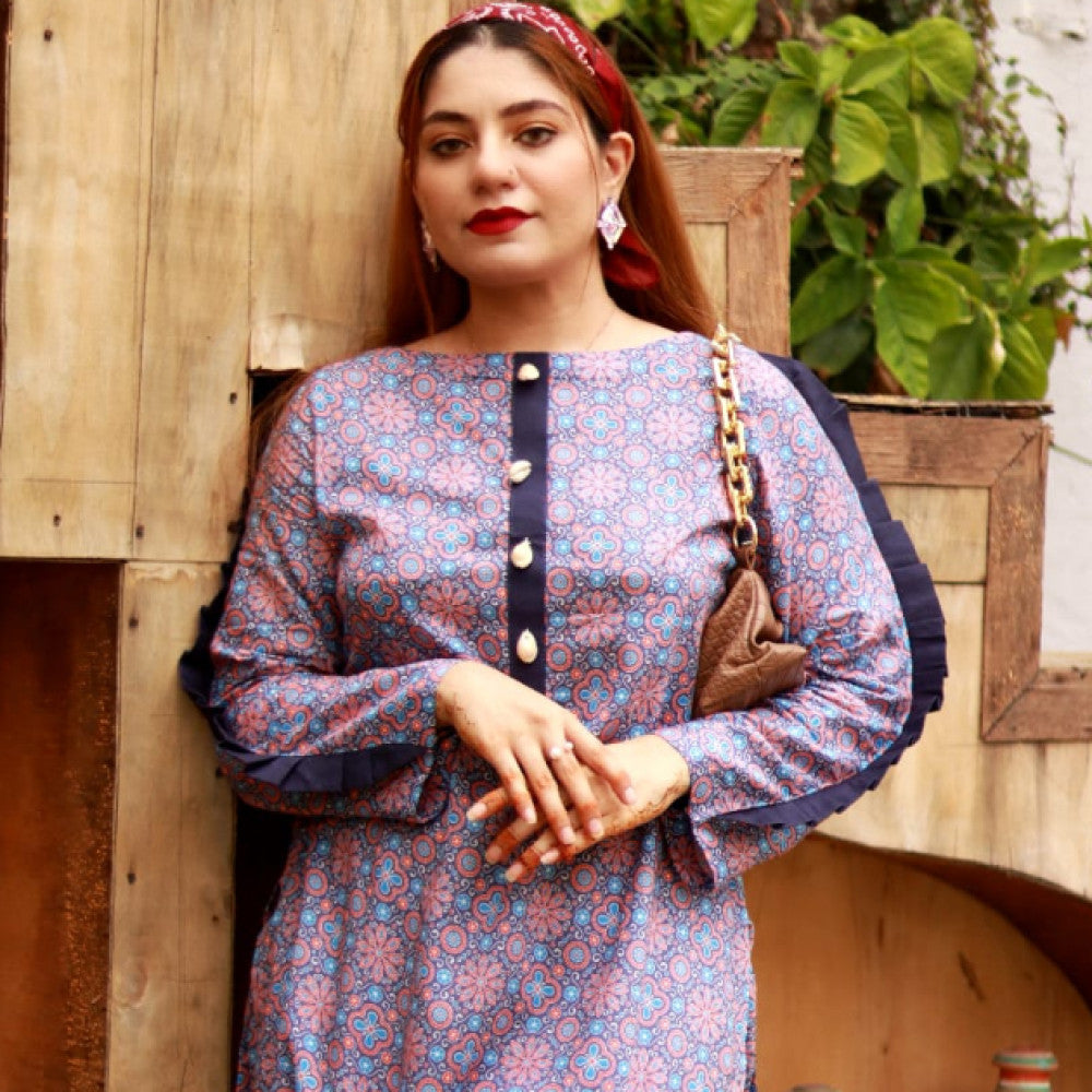 This Ajrak print dress features a stitched shirt and shalwar. The neckline of the shirt is adorned with seashell buttons, and the sleeves have frills making it a perfect blend of traditional and contemporary.